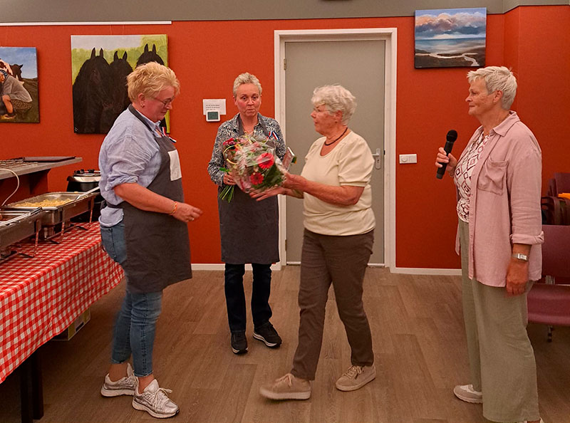 Femke bedankt het “kookteam” voor de goed verzorgde en lekkere maaltijd die zij weer voor ons hebben klaargemaakt. Als dank krijgen Aafke en Henriëtte een bon, een boeketje bloemen en natuurlijk een applaus.