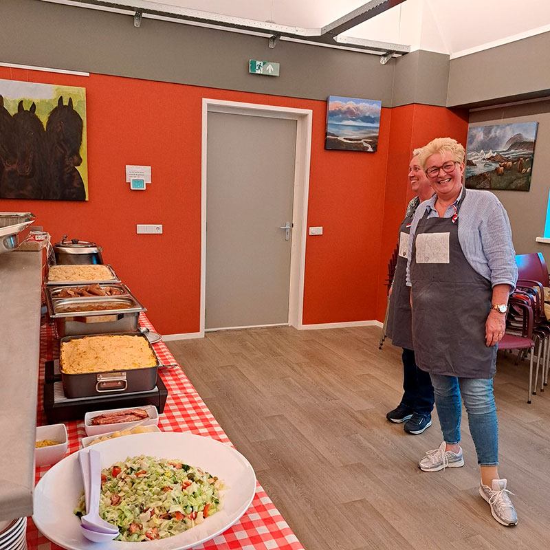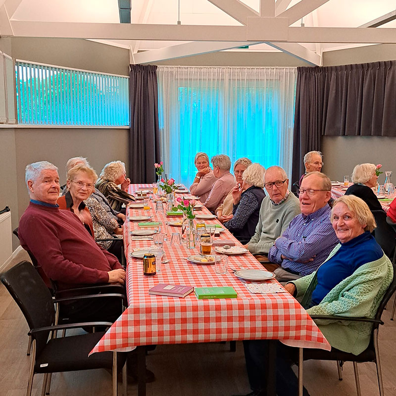 Na het gebed krijgen we een kop heerlijke groentesoep met stokbrood en kruidenboter. Daarna volgt een lopend buffet. We kunnen kiezen uit zuurkoolstamppot met rookworst en gehaktballetjes, Grouwsterovenschotel en een lekker gemengde salade. We genieten allemaal van het lekkere eten. Daarna volgt nog een heerlijk dessert. Als afsluiting krijgen we nog een kopje koffie/thee met wat lekkers. Tussen de gangen door is er gezellig met elkaar gepraat.