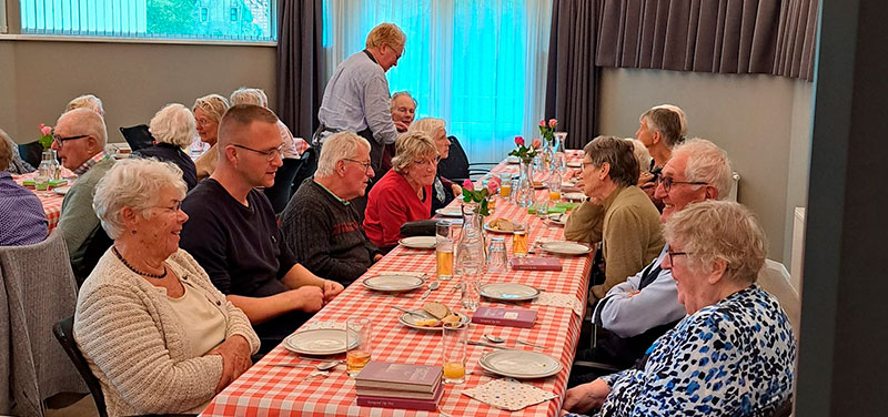 Na het gebed krijgen we een kop heerlijke groentesoep met stokbrood en kruidenboter. Daarna volgt een lopend buffet. We kunnen kiezen uit zuurkoolstamppot met rookworst en gehaktballetjes, Grouwsterovenschotel en een lekker gemengde salade. We genieten allemaal van het lekkere eten. Daarna volgt nog een heerlijk dessert. Als afsluiting krijgen we nog een kopje koffie/thee met wat lekkers. Tussen de gangen door is er gezellig met elkaar gepraat.